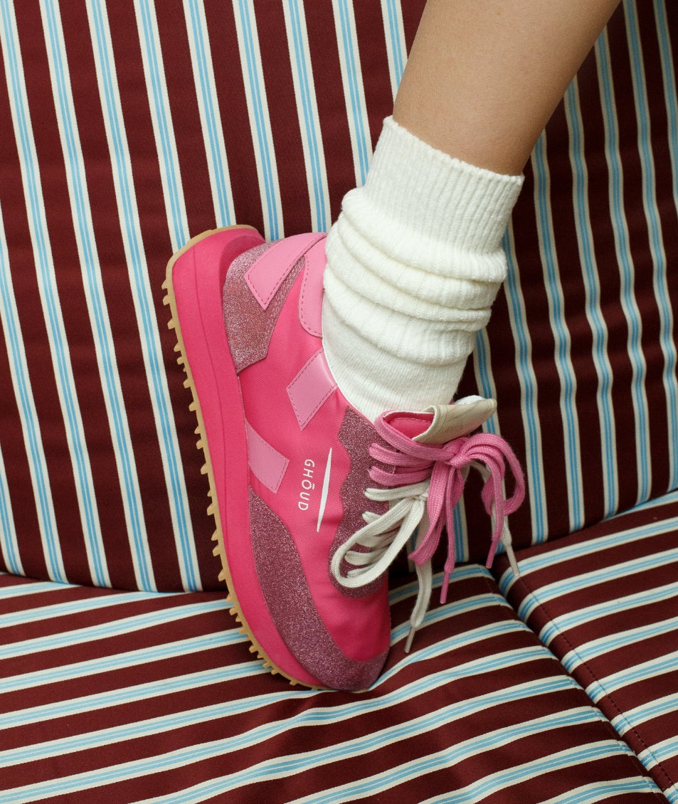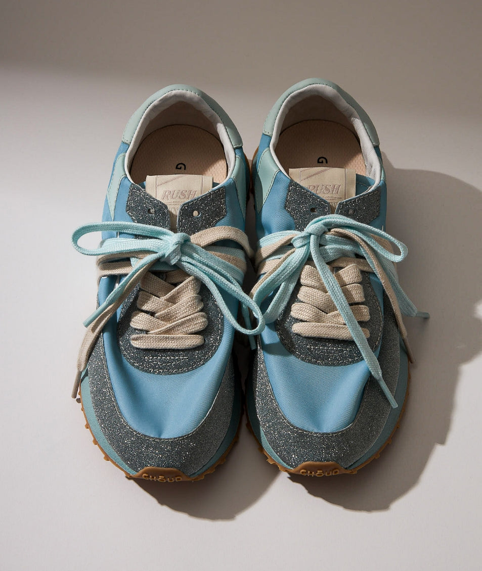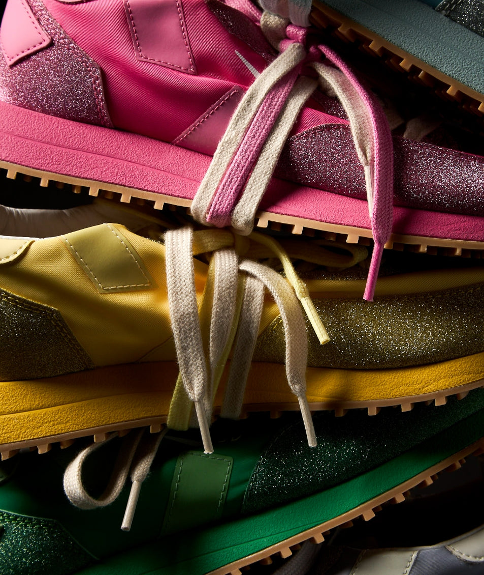 A lively, refreshing, and irresistibly indulgent experience. Shimmering colors, like scoops of freshly made ice cream, add an unexpected touch. The nylon upper in vibrant hues and soft structure, adorned with glitter, blend seamlessly with the originality of the contrasting double laces, creating a unique and dynamic look while ensuring comfort and adaptability with every step. This is the Rush Monoblock Glitter.